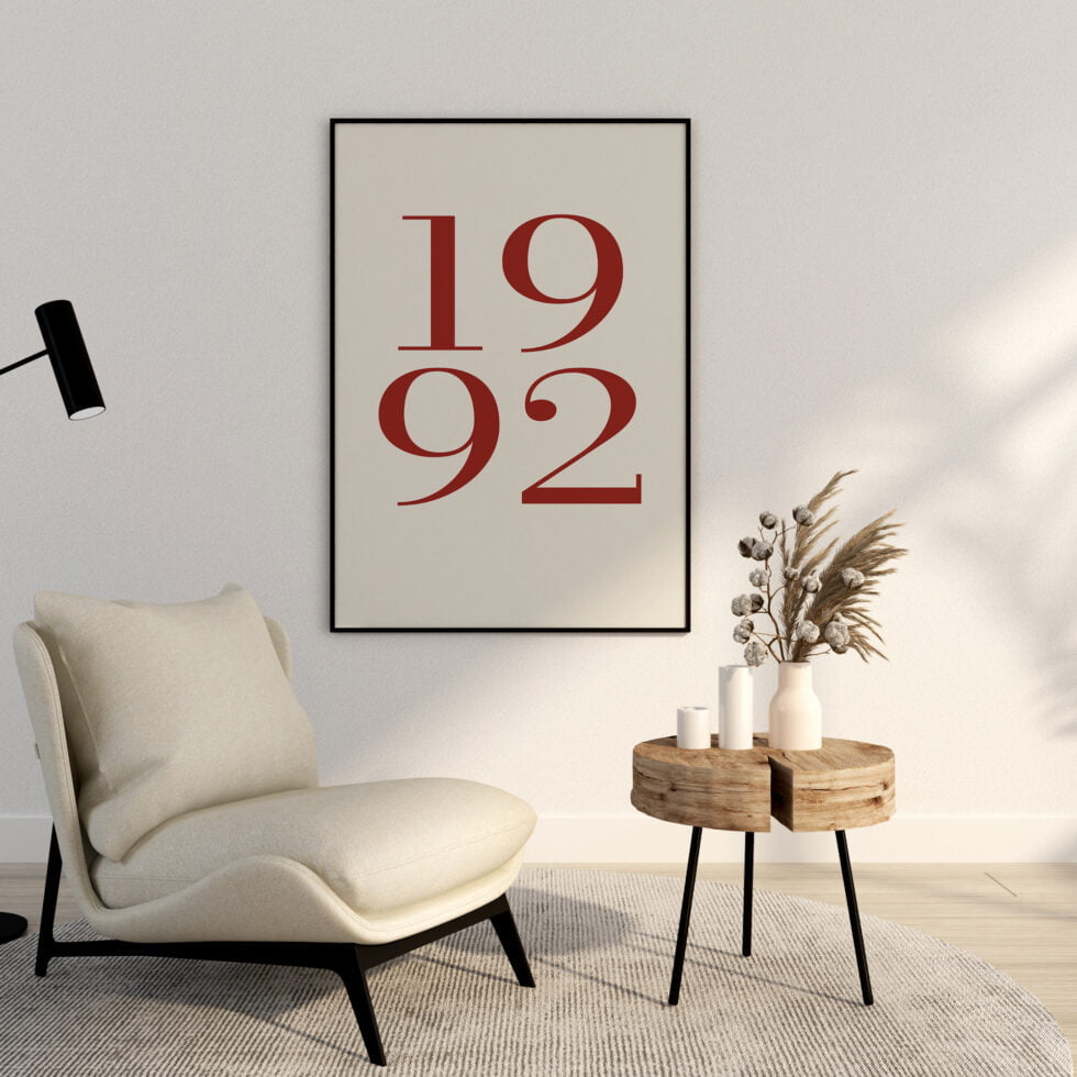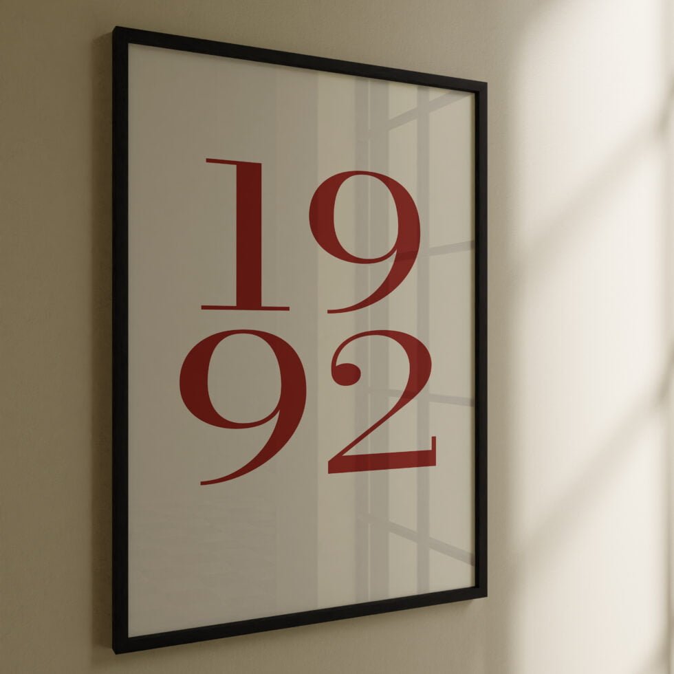 Personalizuotas paveikslas „Metai” yra lengvai pritaikomo 50x70cm dydžio. Dramblio kaulo spalvos fone, raudonos spalvos raidės.