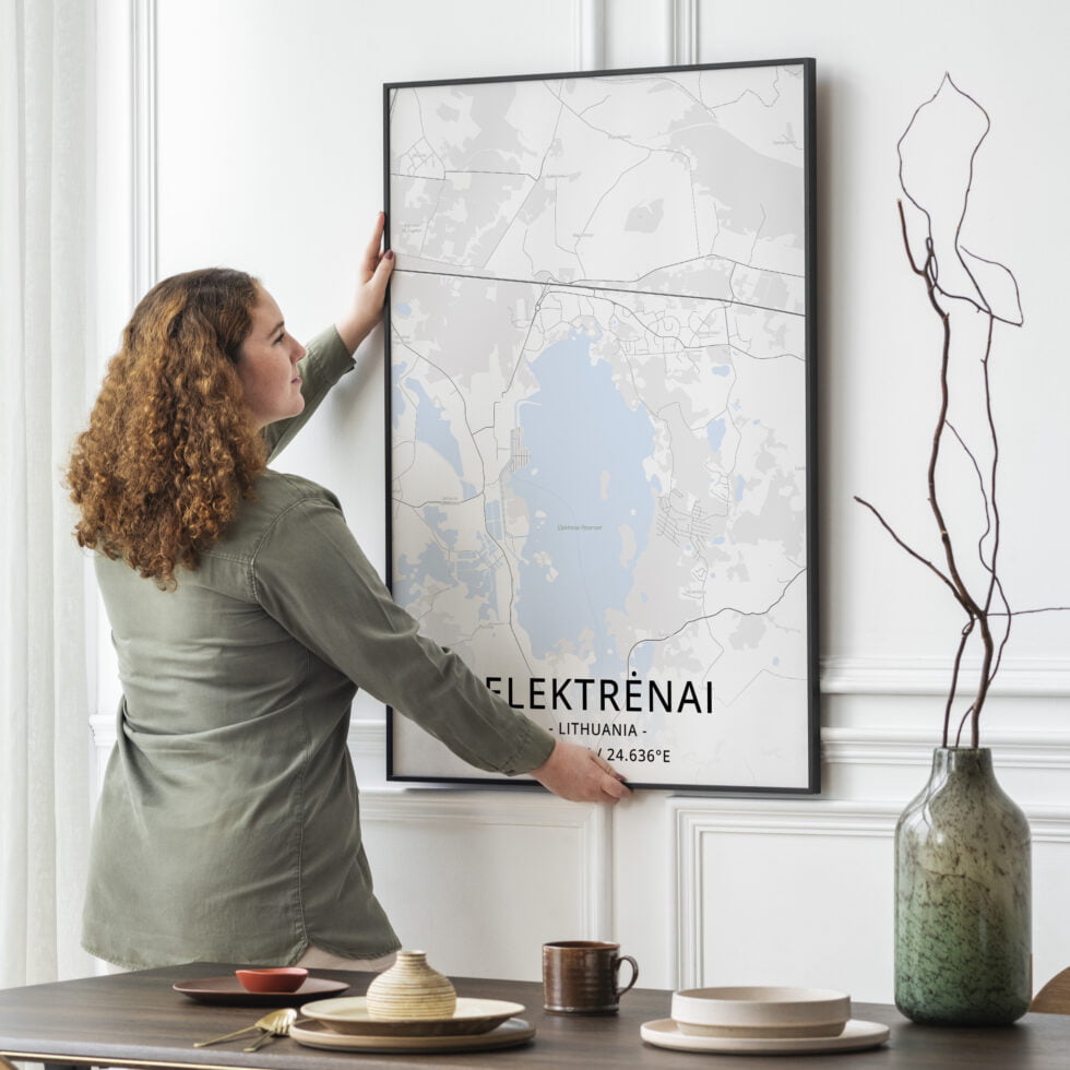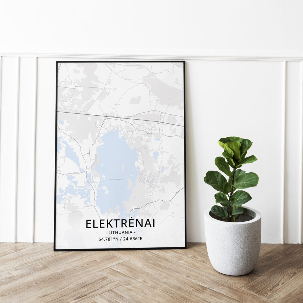 Stilizuotas miesto žemėlapis “Elektrėnai” yra lengvai pritaikomo 50x70cm dydžio.
