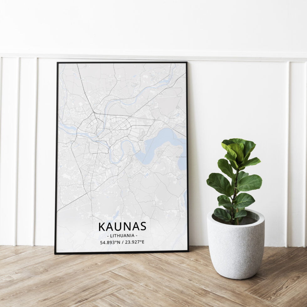 Stilizuotas miesto žemėlapis “Kaunas” yra lengvai pritaikomo 50x70cm dydžio.