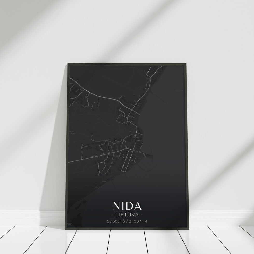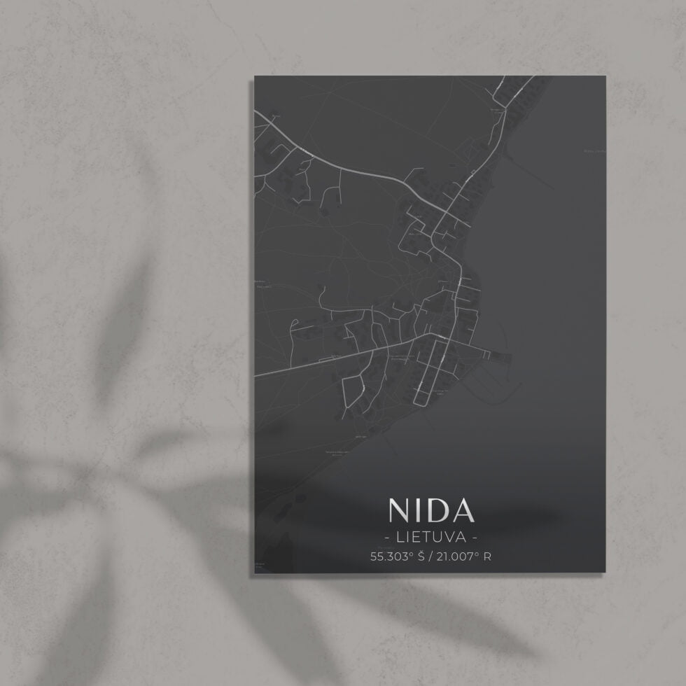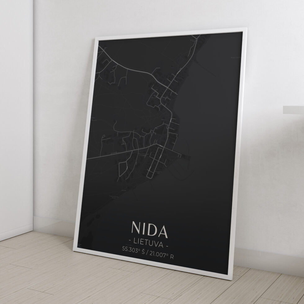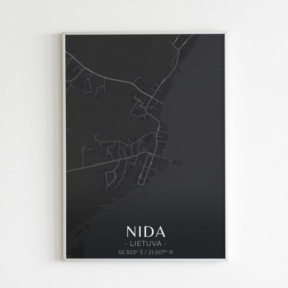 Stilizuotas juodai baltas žemėlapis “Nida” yra lengvai pritaikomo 50x70cm dydžio.