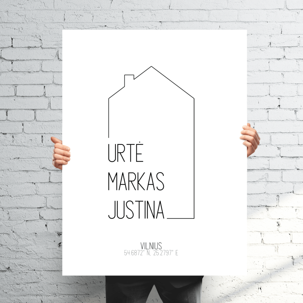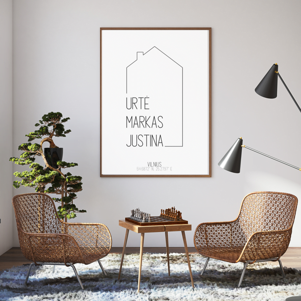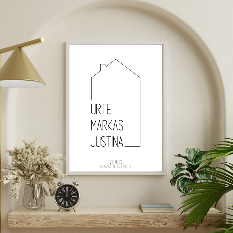 • Paveikslas su Jūsų visų šeimos narių vardais ir Jūsų namų miestu ar vieta – suteiks žavesio Jūsų namams ir primins apie begalinę meilę kuria dalinatės.