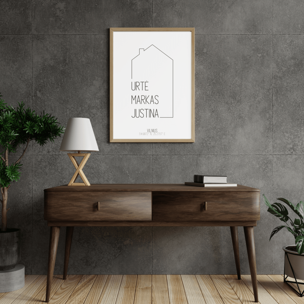 Personalizuotas paveikslas „Namai” Nr.2 yra lengvai pritaikomo 50x70cm dydžio.